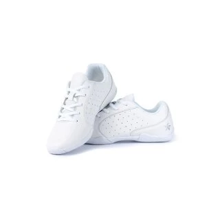 With both stunting and tumbling in mind, we created a white cheer shoe that is easy for bases to grip and flyers to balance in, while also having enough cushion and support for the impact of tumbling.